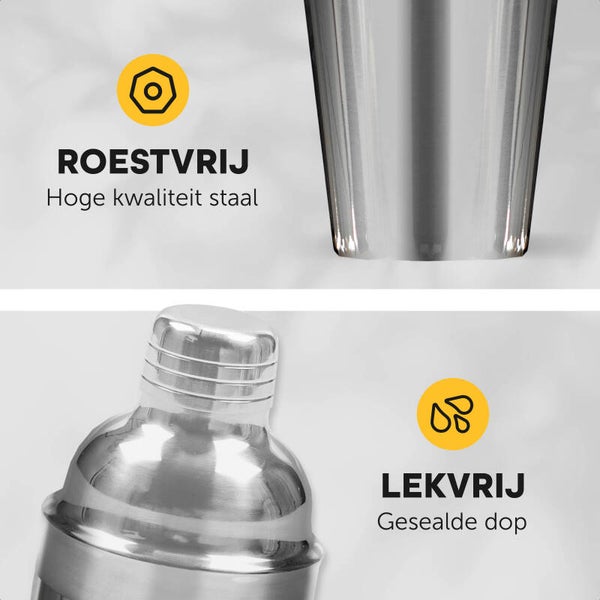 De cocktail set is geheel gemaakt van roestvrij staal.
